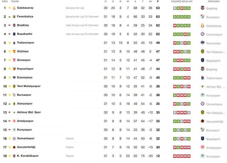 Anlik Puan Durumu Besiktas Galatasaray Maci Sonrasi Son Durum Tum Spor Haber